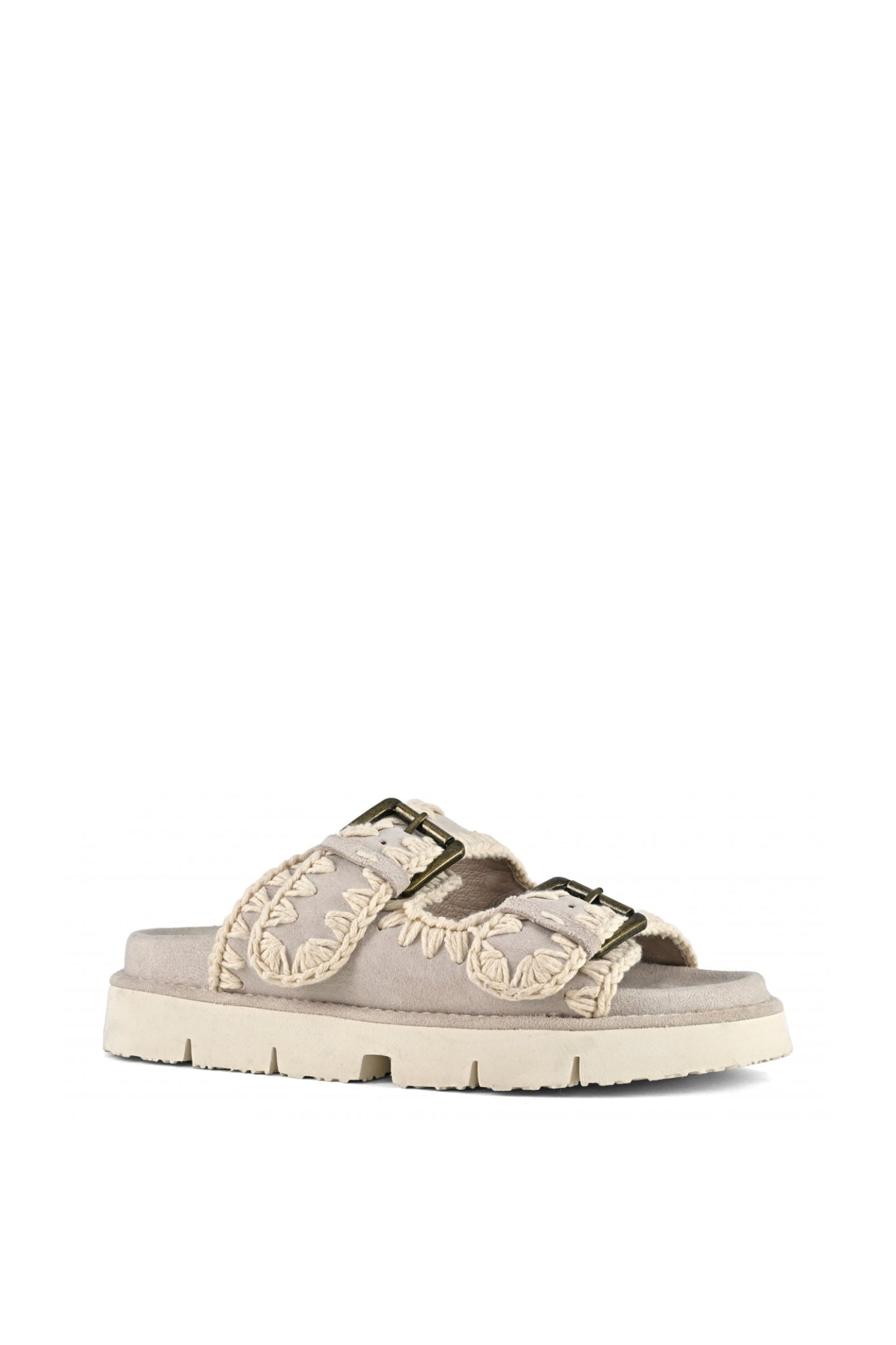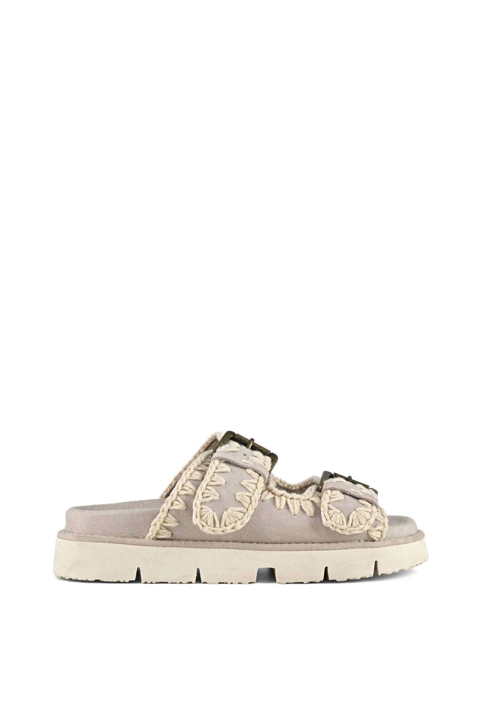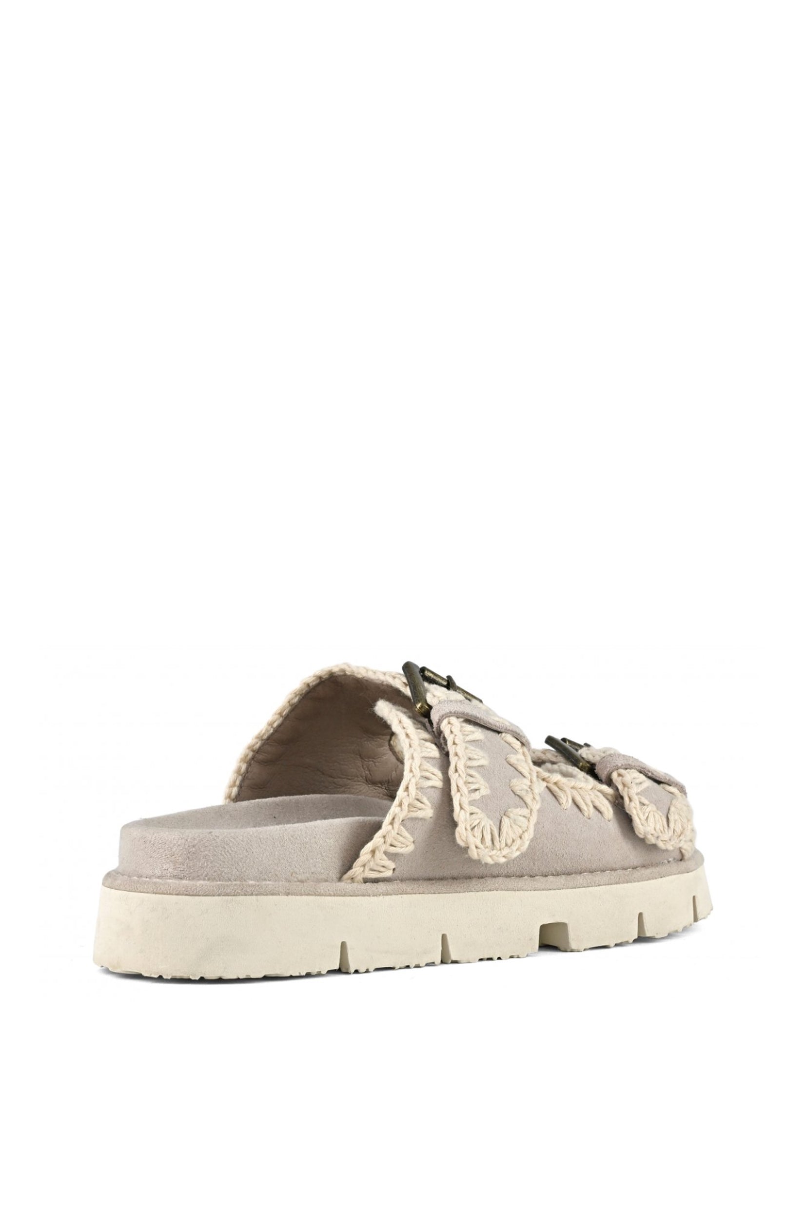 Mou bio papuče sa dva detalja kopče ručno su izrađene od prave kože, sa prepoznatljivim mou heklanim detaljima. Potporni, lagani EVA đon završava se postavljenim uloškom za dodatnu udobnost.