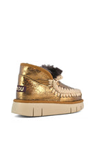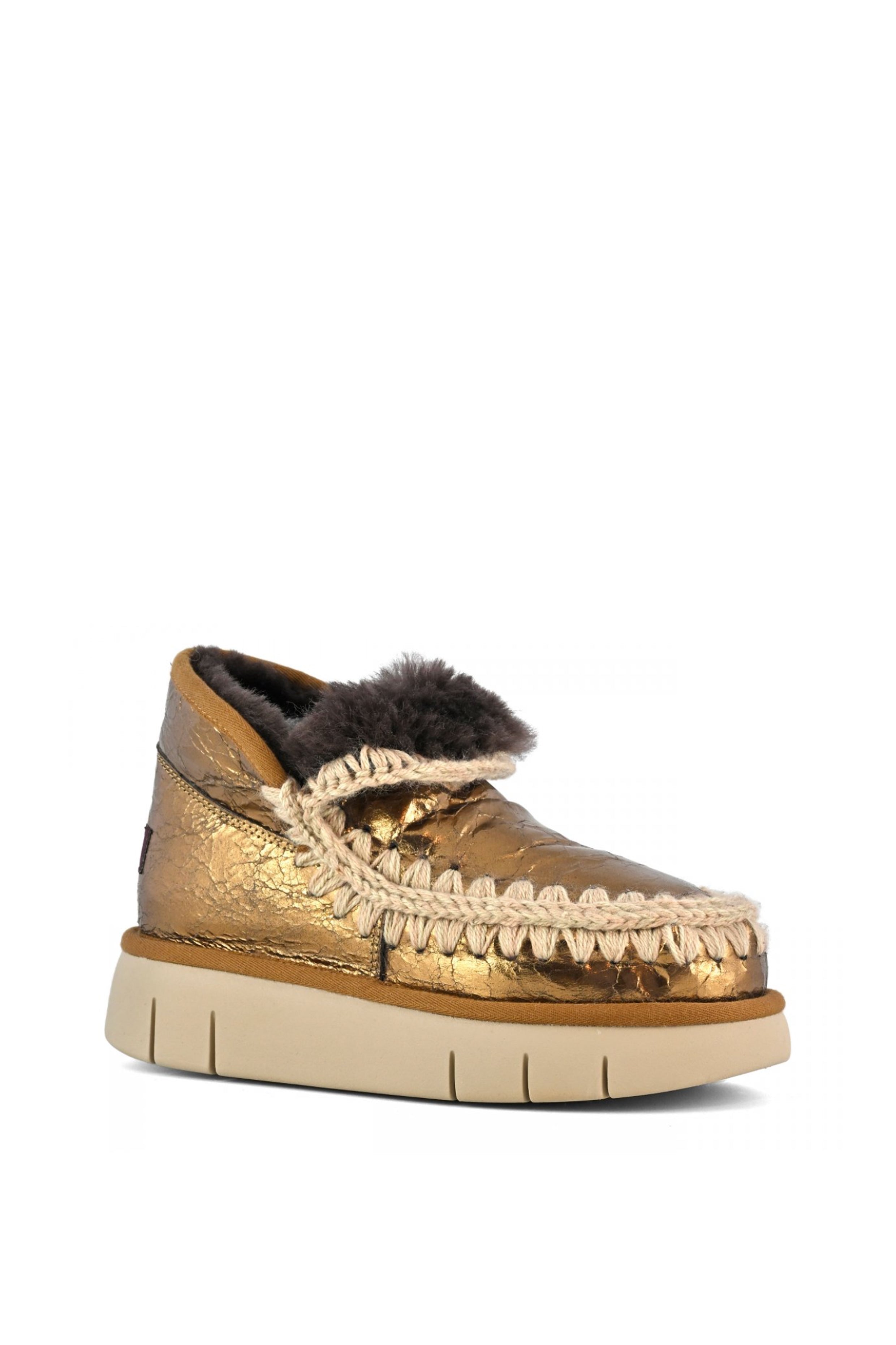 Eskimo  Bounce  je moderan i izdržljiv model iz kolekcije FW24. Sa naglašenim heklanim šavovima, ovaj model donosi hrabar i savremeni twist klasičnom dizajnu Eskimo čizama. Izrađen je od vrhunskog dvostrano obrađenog ovčijeg krzna, koje pruža izuzetnu toplinu i udobnost. Prepoznatljiva ručno heklana vuna od strane Mou brenda dodaje jedinstven, umetnički pečat, dok podržavajući kontra-petni deo garantuje stabilnost i čvrstinu.
