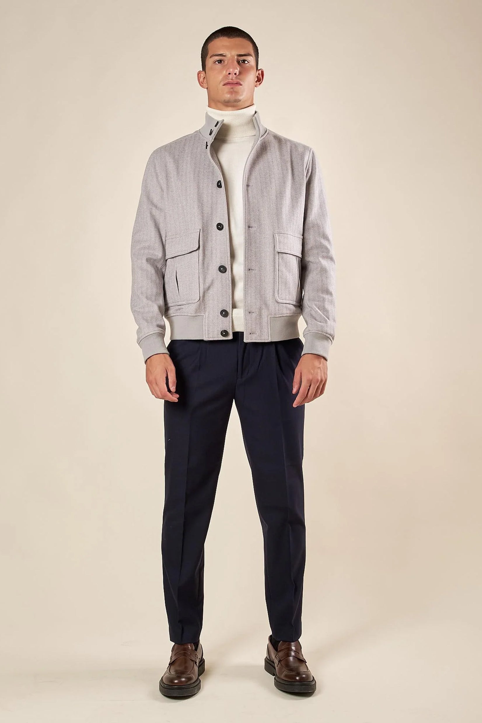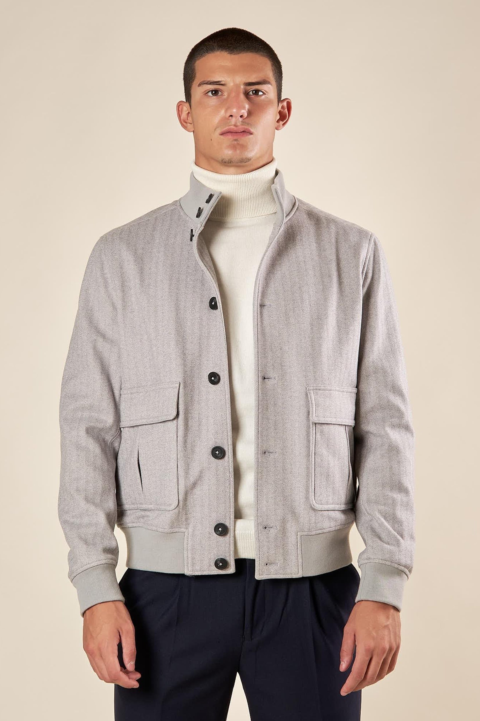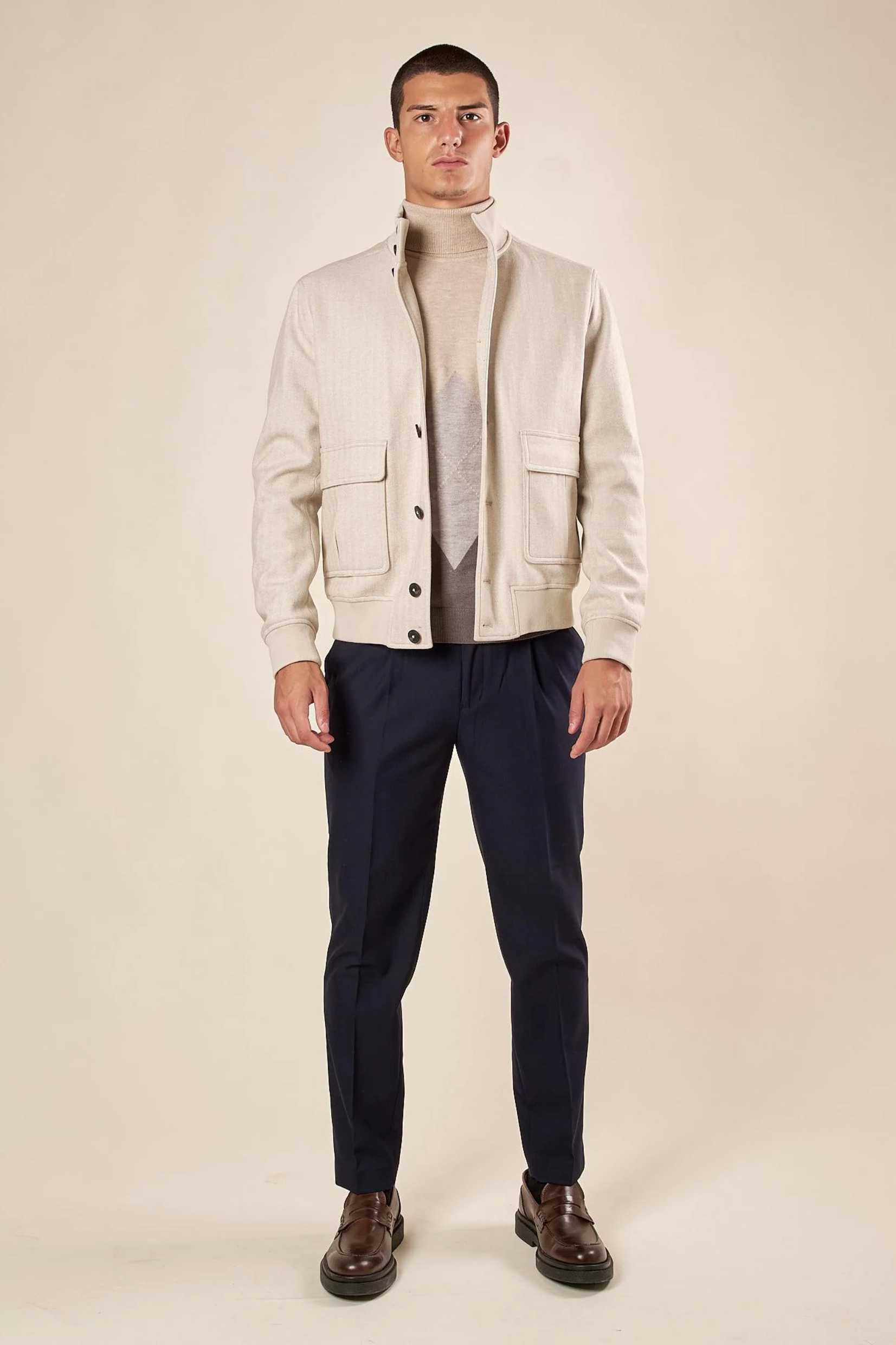Rafinirana i savremena, muška bomber jakna predstavlja savršen izbor za one koji traže univerzalan komad sa sofisticiranim i funkcionalnim dizajnom. Izrađena od tkanine u herringbone (riblja kost) dezenu, ova jakna odiše elegancijom i teksturom koja je čini idealnom za jesenje i prolećne dane.
