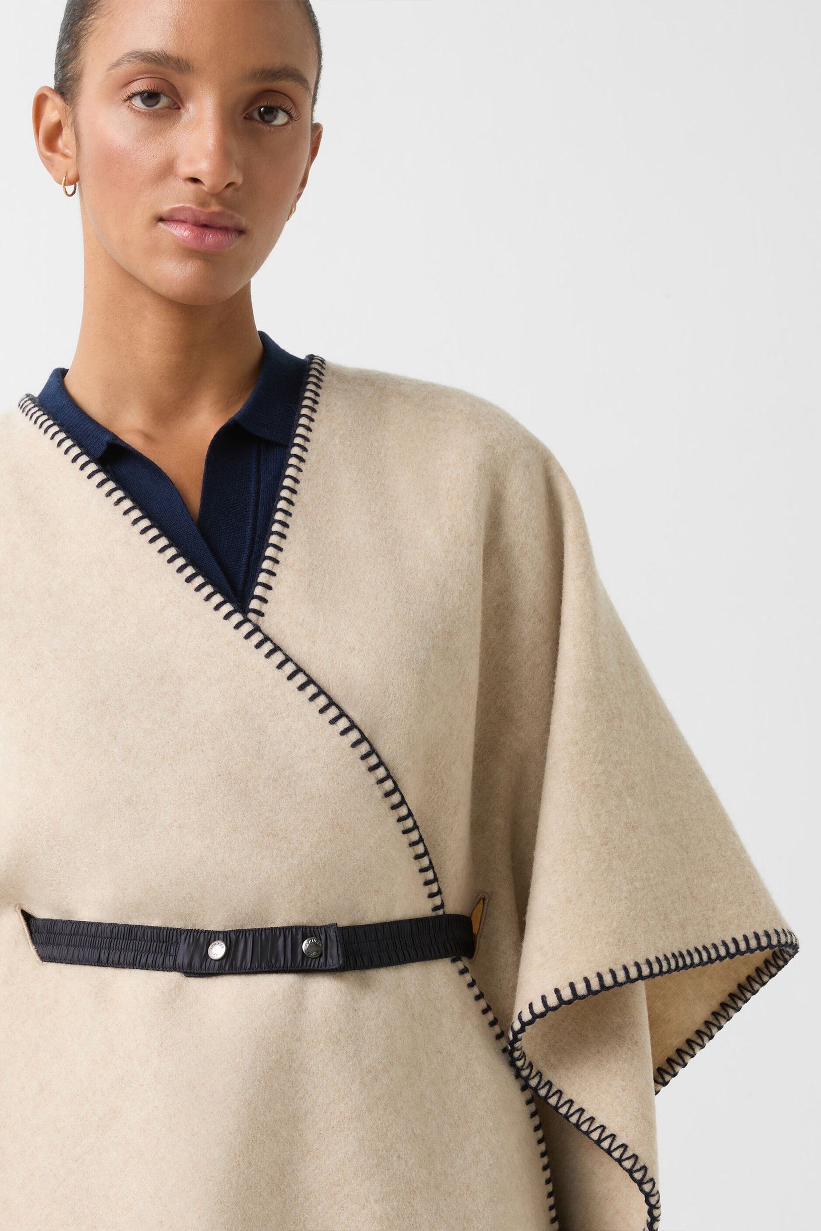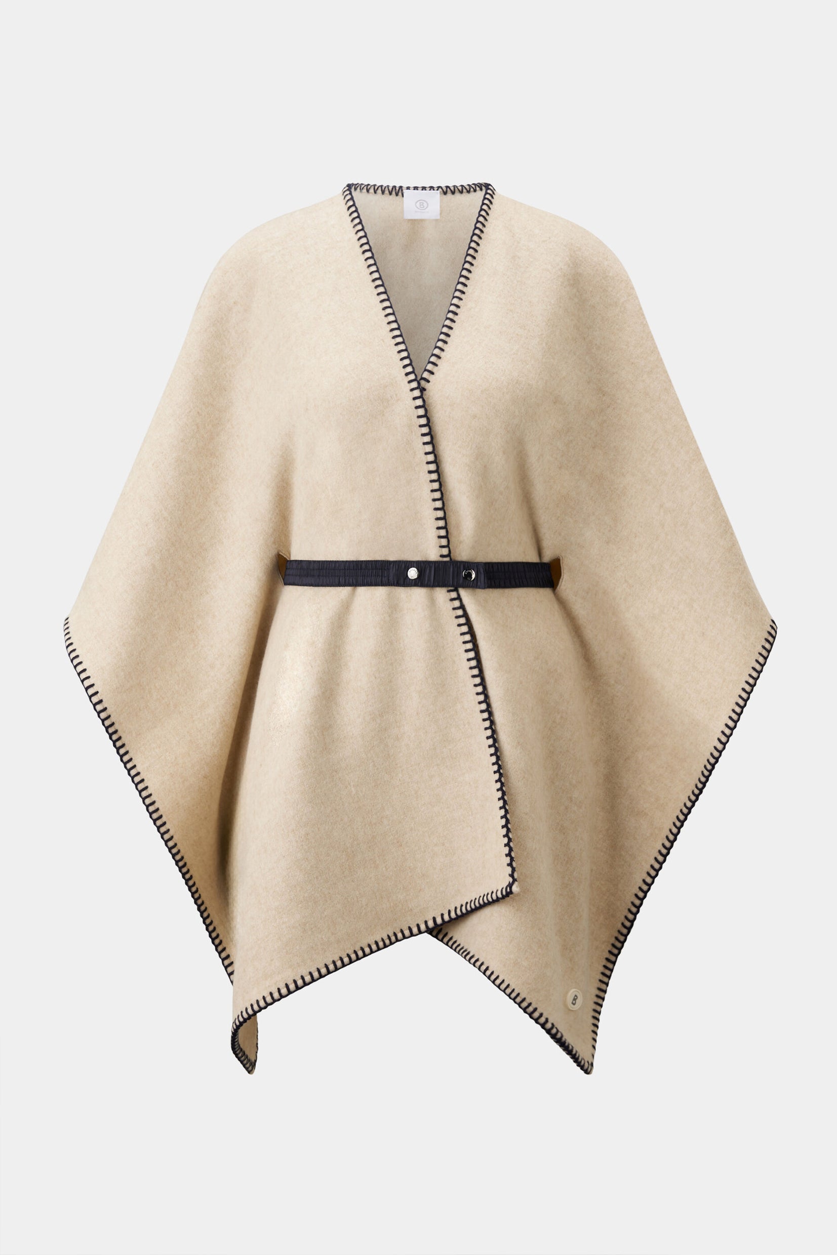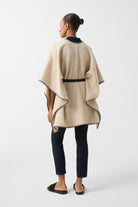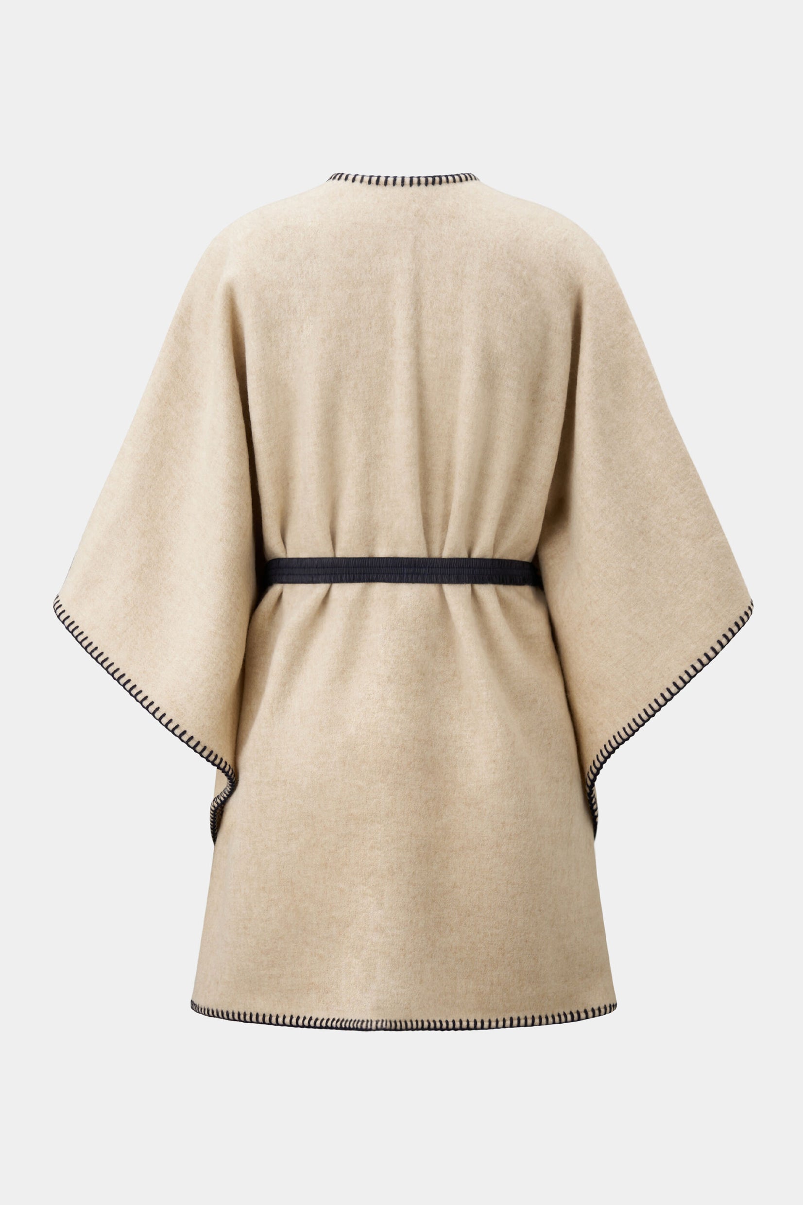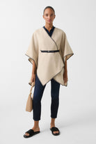 Dekorativno šivenje u kontrastnoj boji i šal ovratnik daju Nancie ponču stil i šarm, pametno upotpunjeni slobodno podesivim najlonskim pojasom od skupljenog rastegljivog materijala sa dugmićima. Tkanina od vune pruža udoban završni efekat.