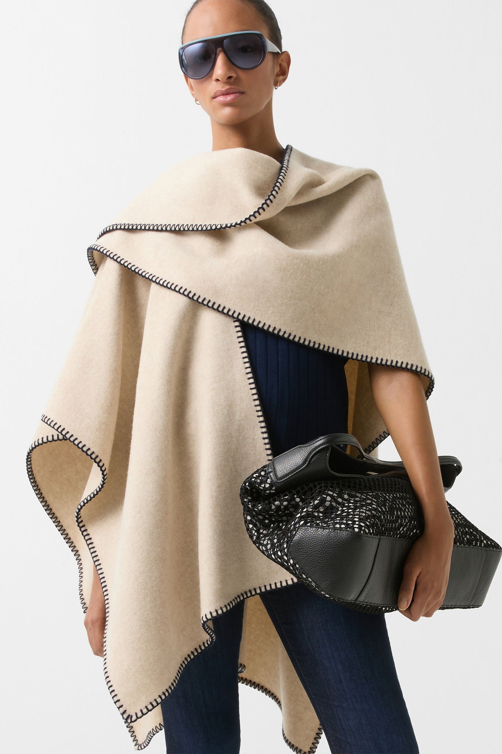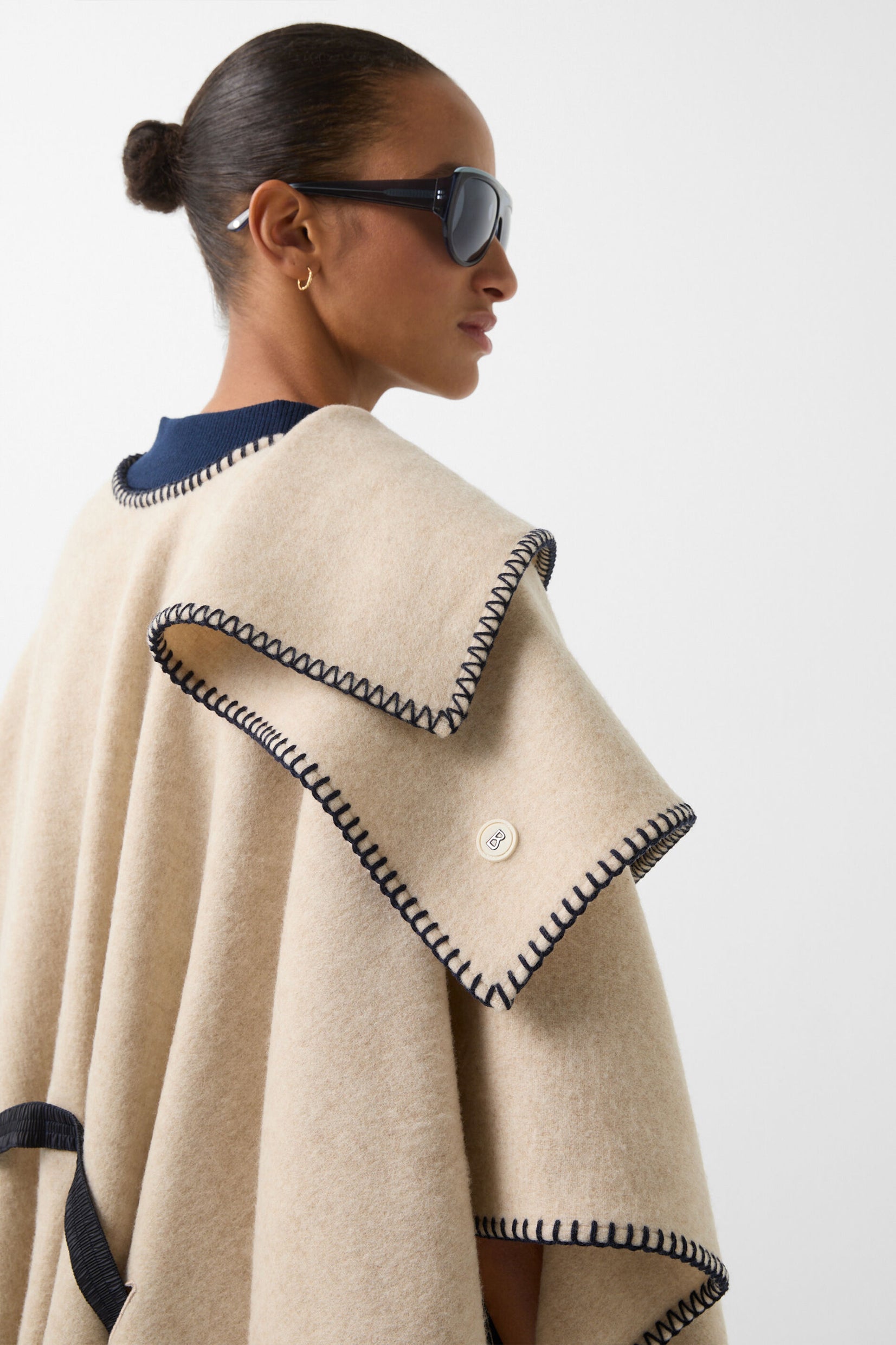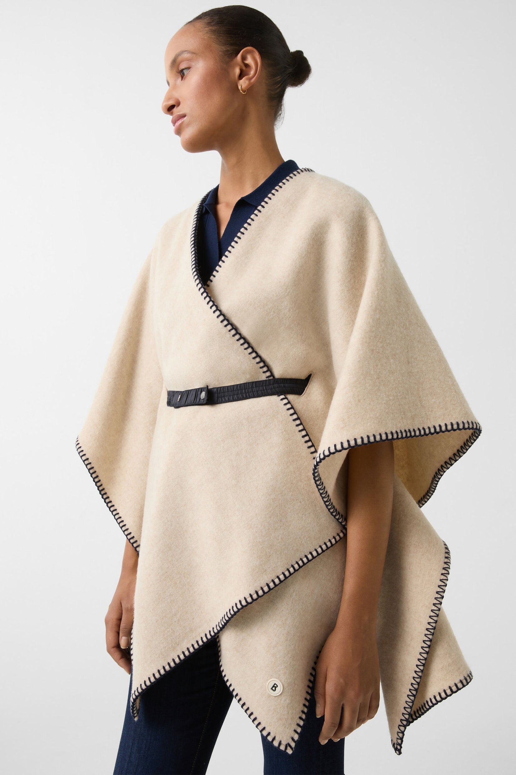 Dekorativno šivenje u kontrastnoj boji i šal ovratnik daju Nancie ponču stil i šarm, pametno upotpunjeni slobodno podesivim najlonskim pojasom od skupljenog rastegljivog materijala sa dugmićima. Tkanina od vune pruža udoban završni efekat.