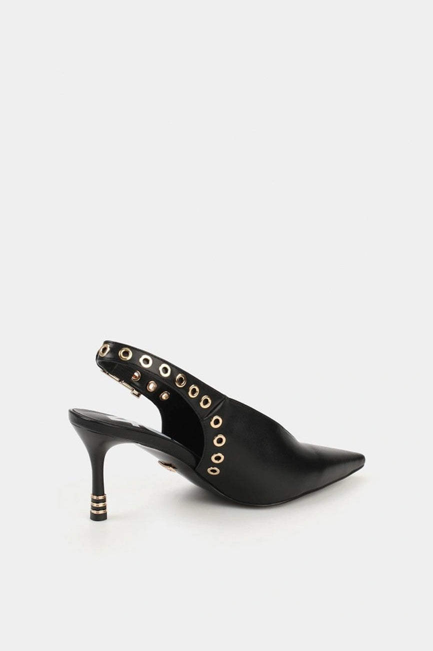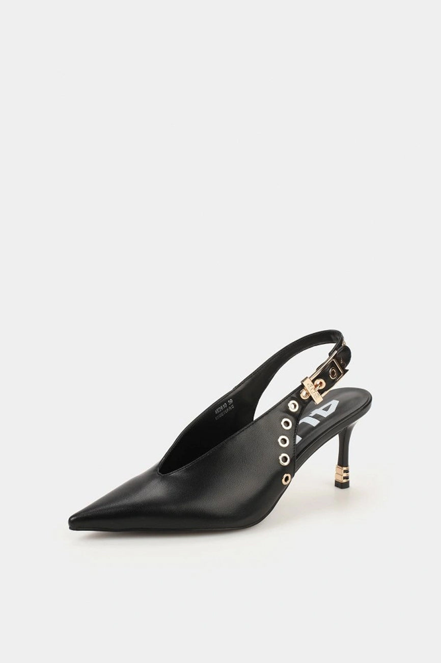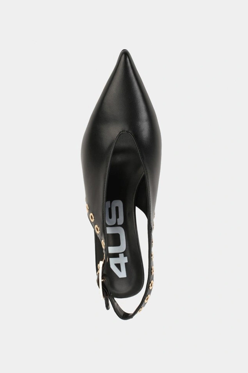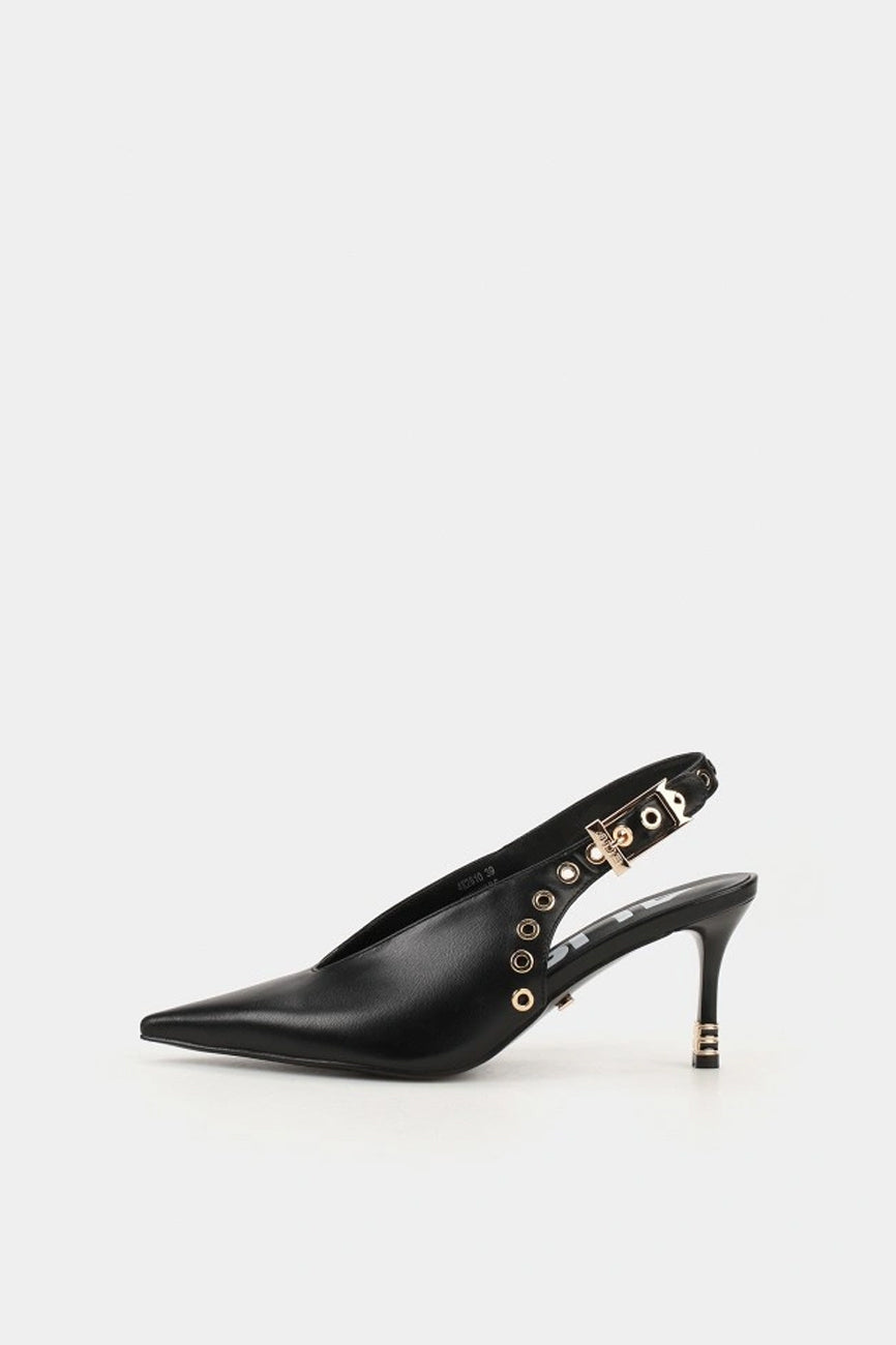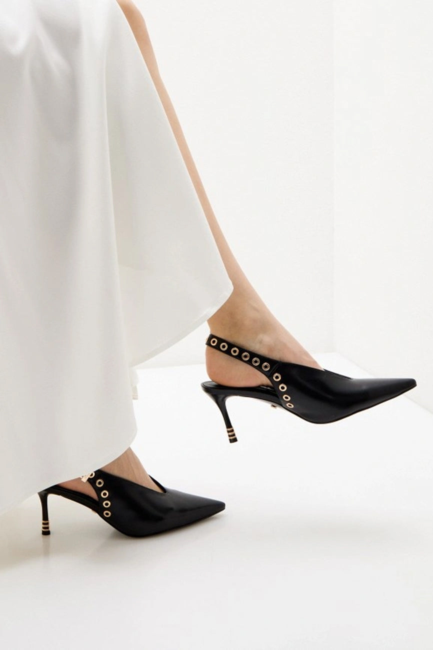 Cipele sa otvorenom petom i špicastim vrhom. Kaiš oko pete sa kopčom i dekorativni metalni detalji. Tanka visoka štikla. Visina štikle: 8 cm