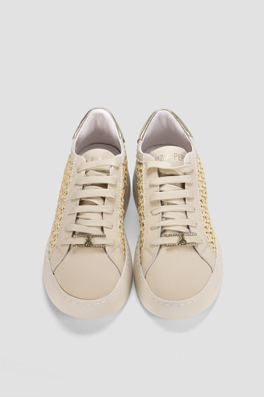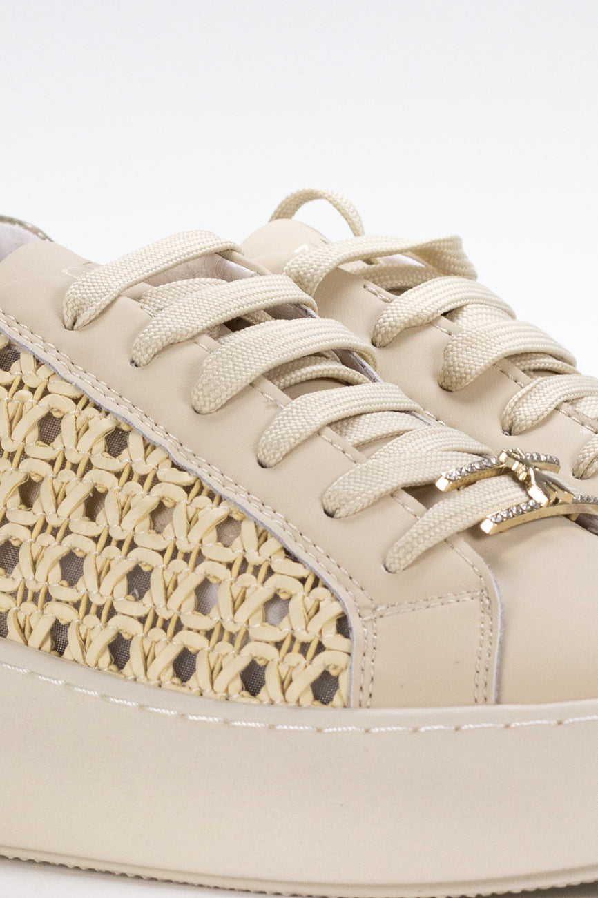 Patrizia Pepe ženske patike u bež tonu kombinuju elegantan dizajn sa modernim detaljima. Bočni panel sa dekorativnim detaljima od prirodnog vlakna daje modelu sofisticiran i lagan letnji izgled, dok zlatni metalni detalji i prepoznatljiv Fly logotip dodatno naglašavaju luksuzan stil. Platform gumeni đon pruža stabilnost i udobnost tokom celog dana, čineći ovaj model idealnim za svakodnevne i elegantne kombinacije.