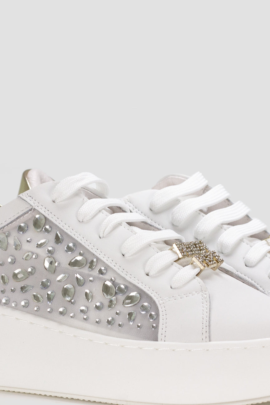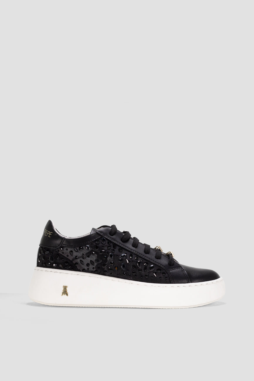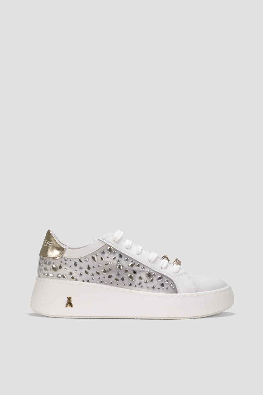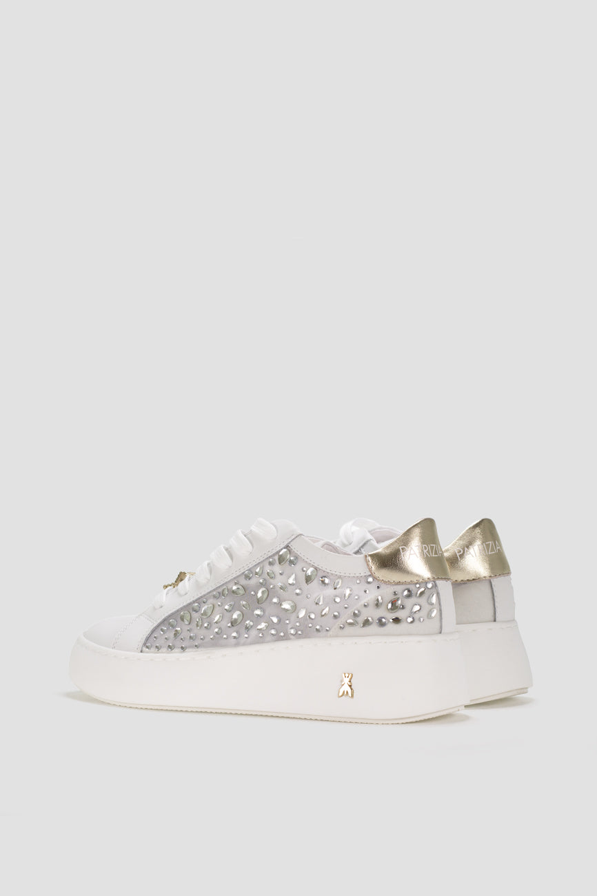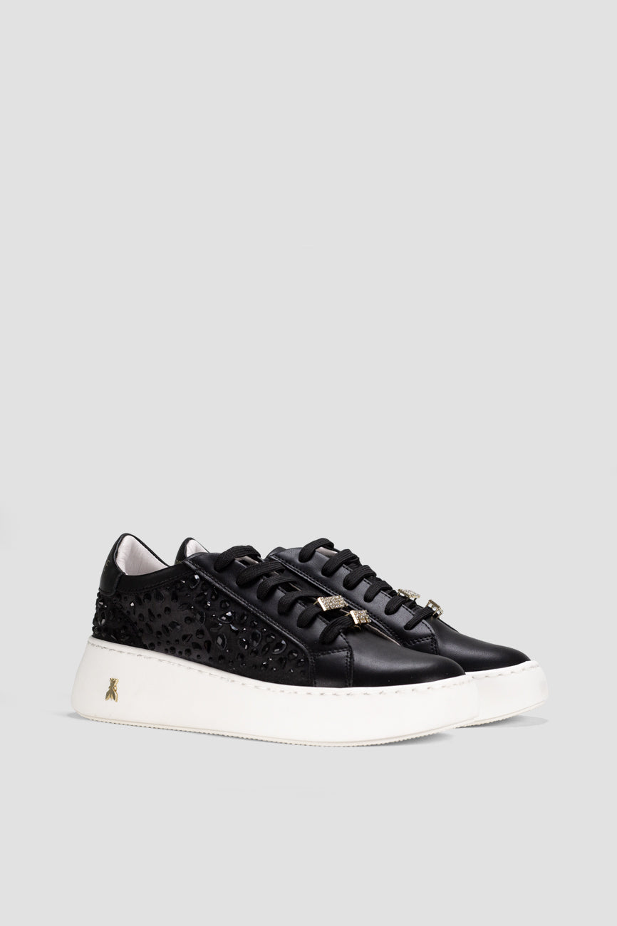 Patrizia Pepe ženske patike od prirodne kože donose spoj elegancije i modernog dizajna. Bočni panel ukrašen dekorativnim kristalima daje modelu upečatljiv i glamurozan izgled, dok zlatni detalji i prepoznatljiv Fly logotip dodatno naglašavaju luksuzan karakter. Platform gumeni đon pruža stabilnost i udobnost tokom celog dana, čineći ove patike idealnim izborom za moderne i sofisticirane kombinacije.